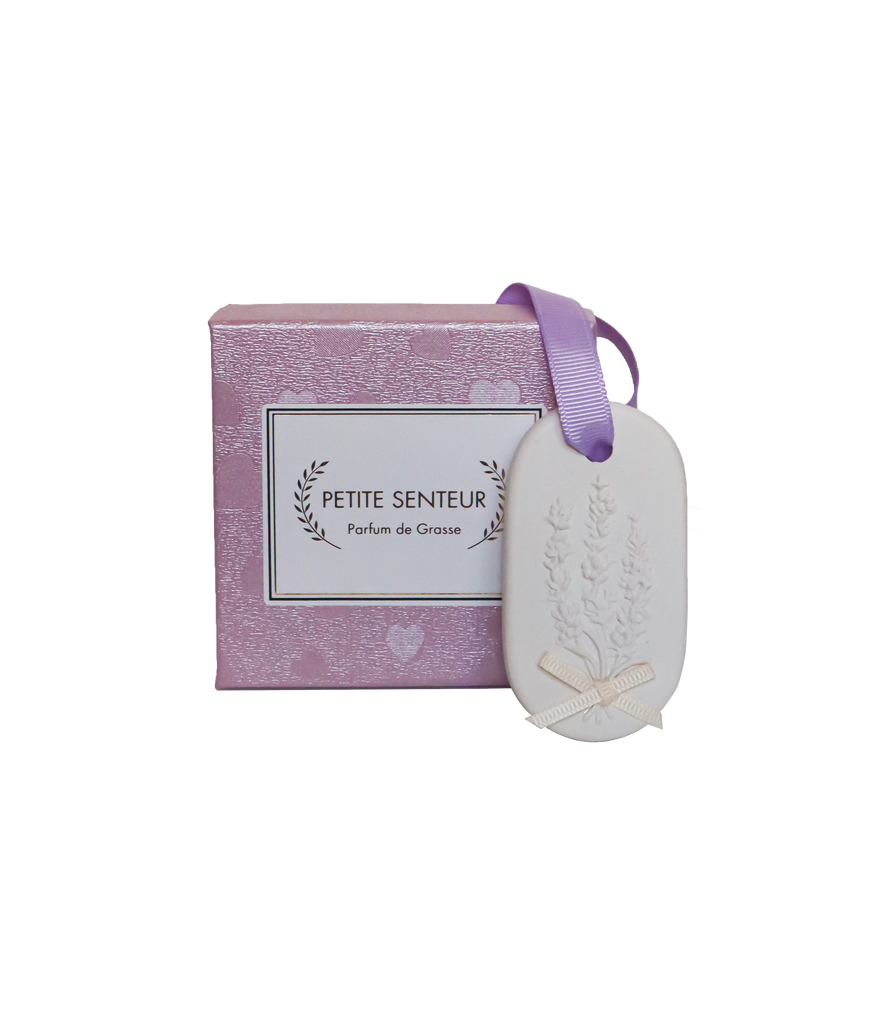Doftmedaljongen mäter 7,5 x 4 cm och har ett ripsband i färgen lila.